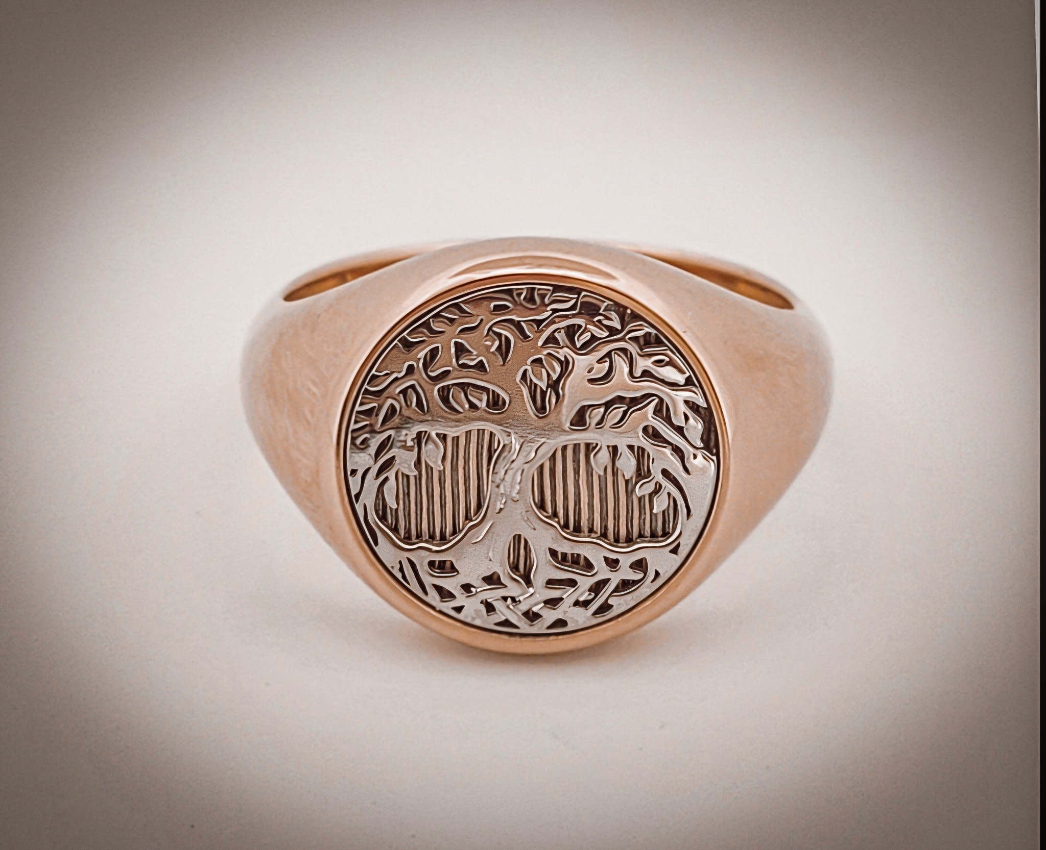 L’inspiration derrière cette chevalière est née de la volonté de créer un bijou à la fois porteur de sens et d’une élégance intemporelle. L’arbre de vie, symbole de force, de résilience et de croissance personnelle, s’impose comme un motif puissant, incarnant l’évolution perpétuelle de celui ou celle qui le porte. L’or rose, avec sa chaleur et sa douceur, sublime ce message en évoquant à la fois l’enracinement et la connexion aux autres, tandis que l’or gris palladié apporte une touche de modernité et de raffinement.
